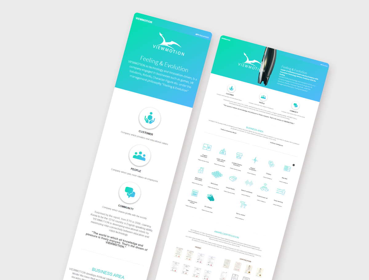 BUSINESS AREA VIEWMOTION develops Artificial Intelligence and Platform Business Model.We have filed and hold our patents in our specialty for decades.We're working to accelerate our business for super-networks and super-individuals era to come. AWARD,CERTI