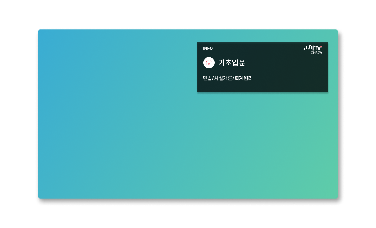 기존 고시티비는 단순 영상을 재생하는 VOD 같은 개념의 서비스였고 후에 정규편성 채널을 운영하게 되었습니다. 이에 따라 기존 VOD같던 아무것도 없는 화면에서 UX/UI적으로 보완할 수 있는 부분을 생각하고 각 편성 중간 컷에 주요 공지사항과 다음 방영 프로그램을 소개하는 컷을 추가하였습니다. 또한 올레TV하단 메뉴로 진입을 할순 있으나 과목이 너무 많고 사용자가 과목을 찾는 과정에서 너무 인지가 떨어진다고 판단하였고 상단노출 이미지 영역을 통하여 현재 채널 및 하위 디덱토리의 과목을 노출시켜 사용성을 개선하였습니다.